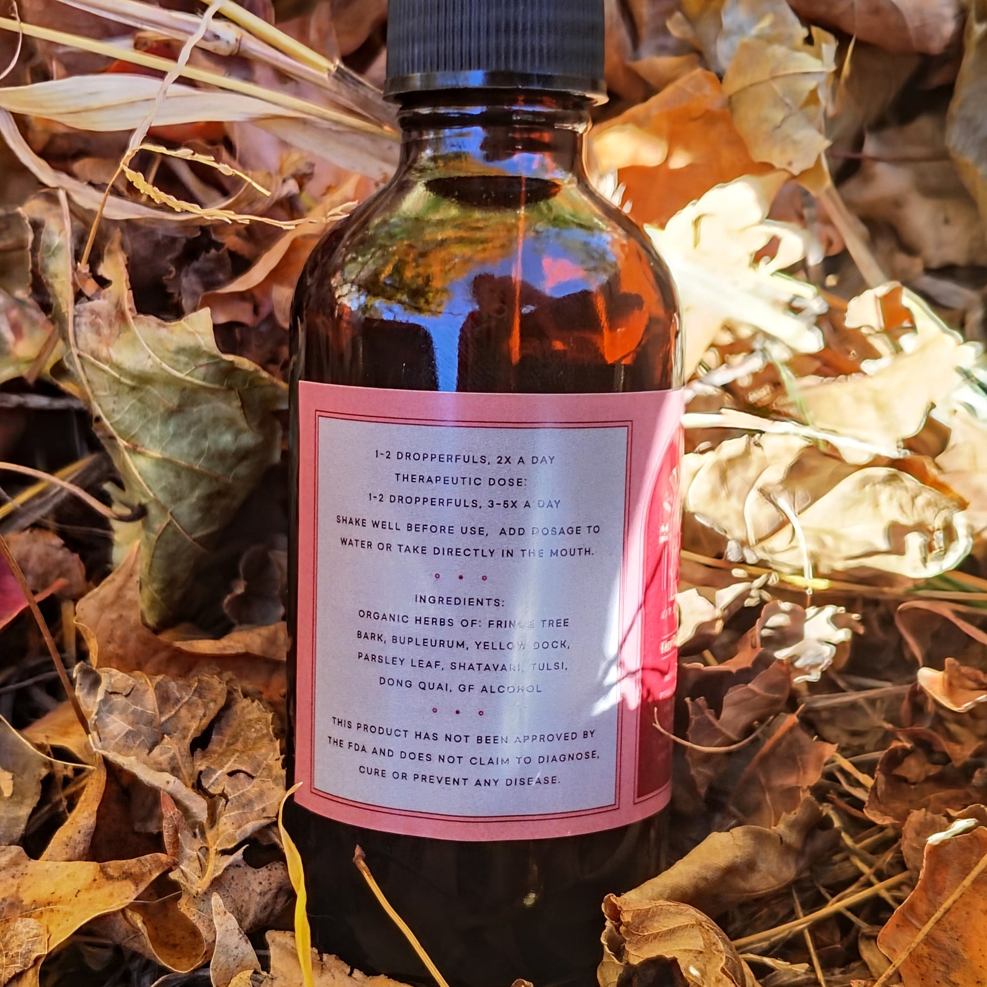 Ingredients: organic herbs of - fringe tree bark, bupleurum, yellow dock, parsley leaf, shatavari, tulsi, dong quai and GF alcohol