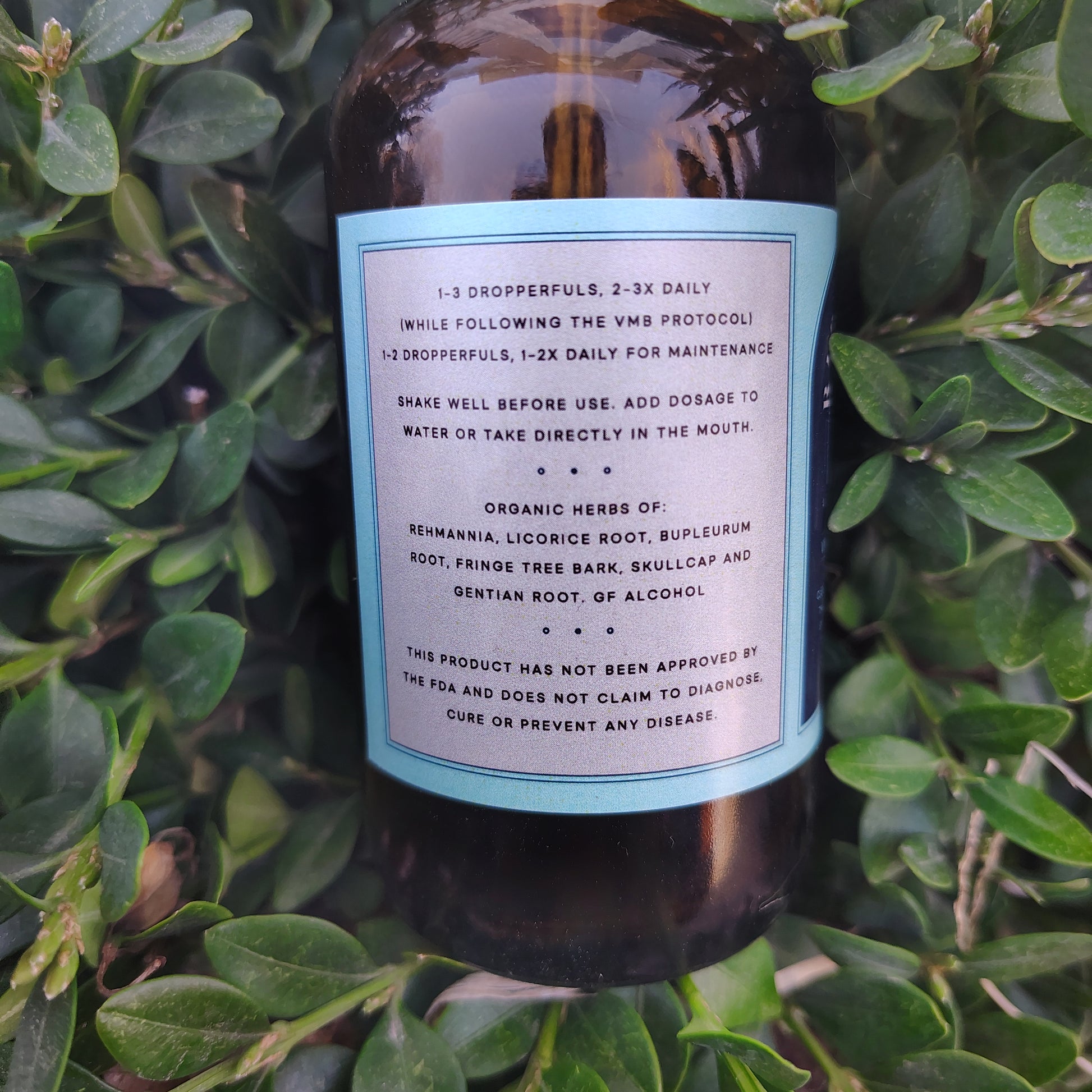 Organic herbs of: Bupleurum root, Fringe tree bark, Skullcap, Gentian root, Rehmannia and Licorice Root. GF alcohol.